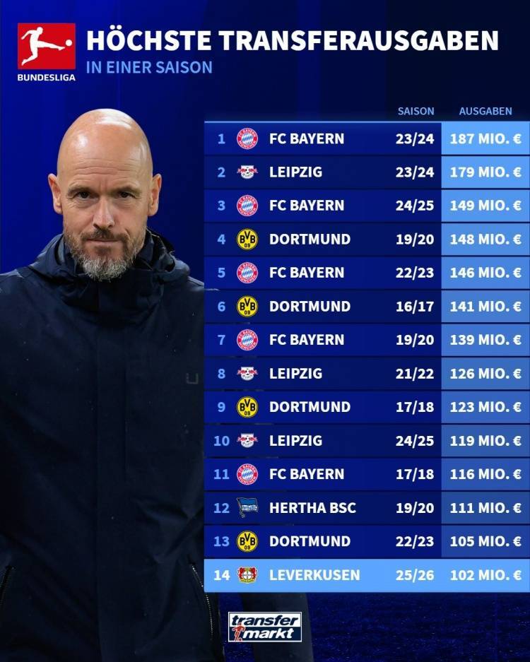 直播吧7月16日讯 据德国转会市场统计,勒沃库森夏窗引援支出突破1亿欧元,成为第5家单赛季引援支出多于1亿欧的德甲俱乐部。