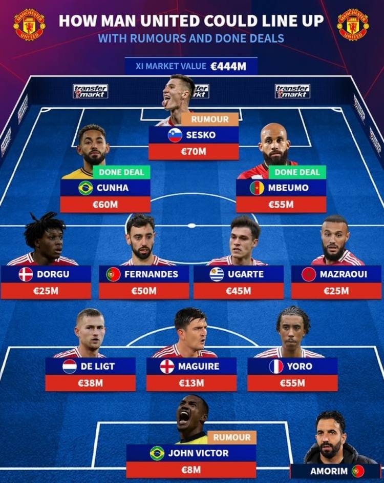 直播吧7月28日讯 《转会市场》根据近期市场动向预测了曼联新赛季主力阵容,前场和门将位置均发生变动。德转预测曼联新赛季主力阵:总身价4.44亿欧元前锋:库尼亚(6000万)、塞斯科(莱比锡,7000万)、姆贝莫(5500万)中场:多古(2500万)、B费(5000万)、乌加特(4500万)、马兹拉维...